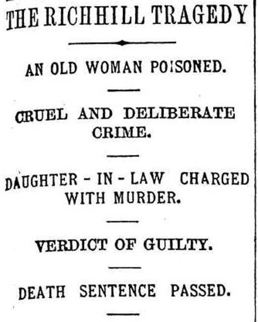 “On the evening of the day of the funeral Agnes Black came to my house and asked me to accompany her to her mother’s house, as she was afraid to go in alone. She said Isaac, her brother, had told her that Sarah Anne had poisoned her mother; that the poison was mixed in her dinner of potatoes and eggs. She said the old woman had got something in the morning, but it didn’t affect her. About a week after the funeral she told me that Sarah Anne wanted her to come up and give the old woman the dinner she had prepared for her. She did not do so, but she said if she had her little boy would have been poisoned too.”
