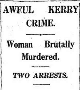 “I came to the front door which I found locked, so I went around to the back door and entered the kitchen. I then saw my wife lying in a pool of blood on the floor. She was dead. I did not recognise her face at all; it was cut off. I then went to the house of my neighbour, Thomas Blennerhassett. Lucy Blennerhassett came back with me and looked in from the kitchen door and then went away. I then went to Thady Nolan’s, and someone went for the priest. Thade Nolan and James O’Brien then came with me, and we went back to my house. On entering James O’Brien found a hatchet covered with hair and blood. I went upstairs to the bedroom and found the trunk that my wife kept her money and deposit receipts in a large pocket book, had been broken open. The pocket book and the money were gone. A hammer that I kept in an oiled cloth in a drawer downstairs was lying on the floor beside the trunk.”